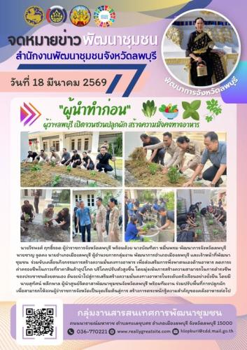 วันพุธที่ 18 มีนาคม 2569 เวลา 16.00 น. นายวีรพงศ์ ฤทธิ์รอด ผู้ว่าราชการจังหวัดลพบุรี พร้อมด้วย นางบัณฑิตา หมื่นพรม พัฒนาการจังหวัดลพบุรี นายชาญ จูดคง นายอำเภอเมืองลพบุรี ผู้อำนวยการกลุ่มงาน พัฒนาการอำเภอเมืองลพบุรี และเจ้าหน้าที่พัฒนาชุมชน ร่วมขับเคลื่อนกิจกรรมการสร้างความมั่นคงทางอาหาร เพื่อส่งเสริมการพึ่งพาตนเองด้านอาหาร ลดภาระค่าครองชีพในภาวะที่ราคาสินค้าอุปโภค บริโภคปรับตัวสูงขึ้น โดยมุ่งเน้นการสร้างความสามารถในการดำรงชีพของประชาชนด้วยตนเอง อันจะนำไปสู่การเสริมสร้างความมั่นคงทางอาหารในระดับครัวเรือนอย่างยั่งยืน